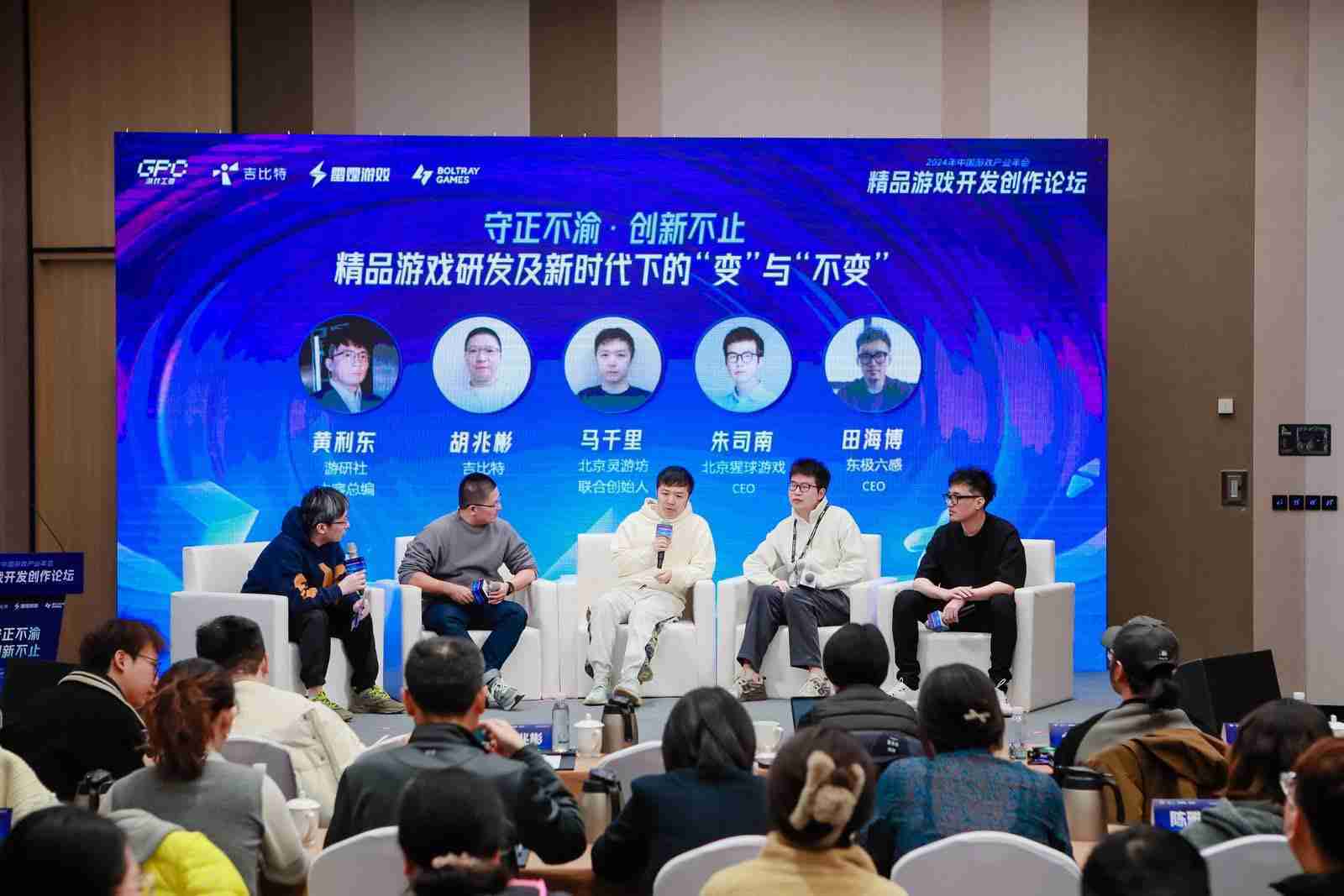 圆桌对话环节,,在游研社内容总编黄利东的主持下,,,,yaxin111CTO胡兆彬、、北京灵游坊联合创始人马千里、、北京猩球游戏CEO朱司南、、、、东极六感CEO田海博等四位嘉宾围绕“守正不渝、、、创新不止——精品游戏研发及新时代下的‘变’与‘不变’”这一主题分享了各自在精品游戏开发理念及工程能力搭建方面的见解和经历,,,并就行业变化下游戏人需要坚守的理念等展开交流探讨。。