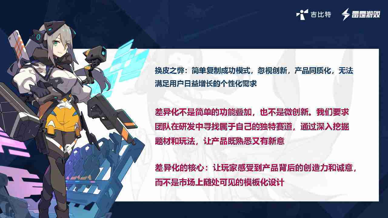 在我们内部是这么定义差异化的。。。。首先,,,差异化不是简单的功能叠加,,,,更不是换皮。。。。只是换皮,,产品无法提供有效的市场价值。。内部经常说差异化的产品不是为了迎合市场,,而是找到一个自己独特的表达方式,,,在研发中找到属于自己的细分赛道和独特赛道,,,前提是需要对这个题材有足够的深入、、挖掘,,对玩法有足够深入的理解,,,让产品看起来既熟悉又有新意。。。