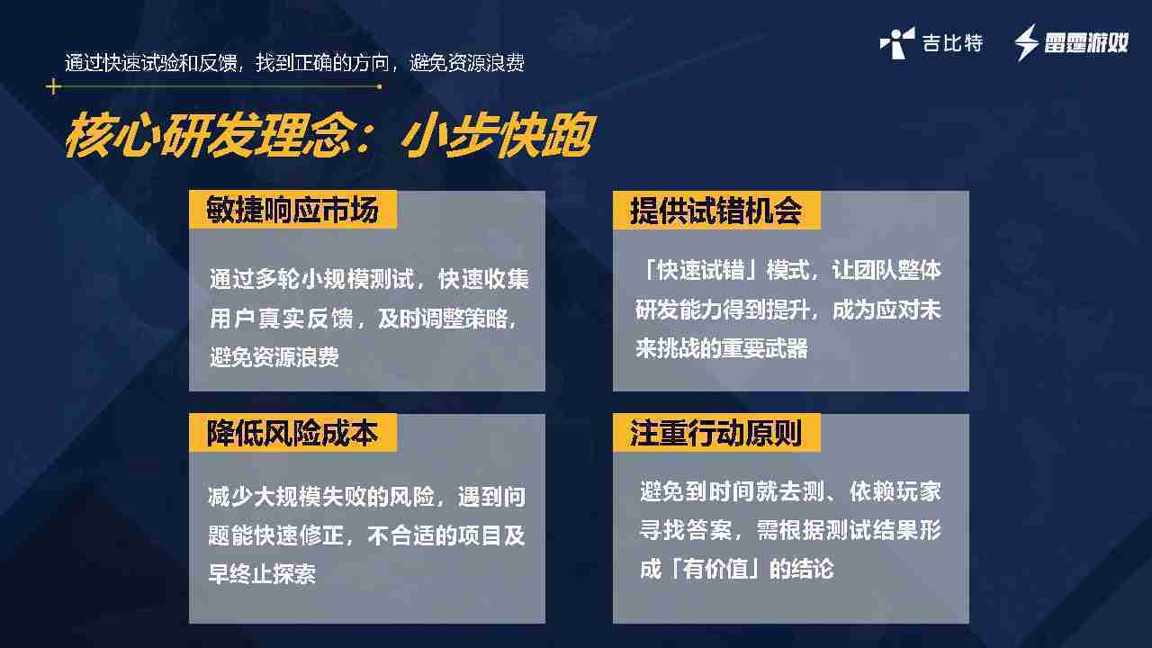 小步快跑不是找答案,,而是验证答案。。我们之前有项目是这样的,,,,有些制作人会有几个方向觉得都可以做,,,但是不确定做哪一个,,,会选择几个都做,,,做完拿到市场跑,,,跑出哪一个更好,,,基于这个再做后续的研发和拓展。。。但这种情况最容易出现一个问题,,可能被玩家裹胁,,,玩家说这个点不错、、那个点不错,,到底听还是不听,,,不听感觉是无视玩家的反馈,,,,听的话,,可能自己没想清楚导致研发思路发生偏颇。。所以针对这一点后面自己复盘整理,,,,发现制作人自己心里要有数,,,要做自己觉得好玩的,,而且明确知道这个东西是你想做的,,然后拿到市场验证这个答案是不是对的,,而不是拿一堆答案找哪一个答案更好。。。