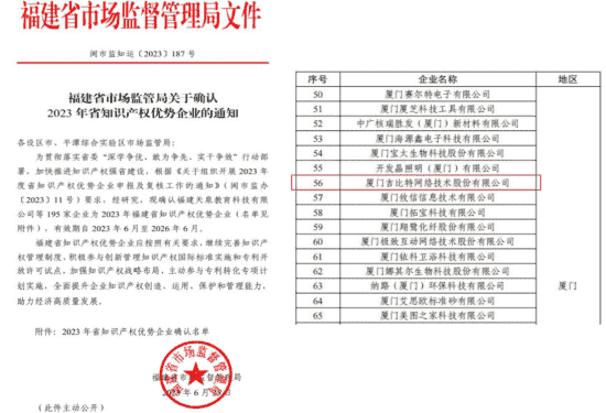 近日,,福建省市场监督管理局公示了2023年福建省知识产权优势企业名单,,,,厦门yaxin111网络技术股份有限公司(以下简称“yaxin111”或“公司”)榜上有名。。。